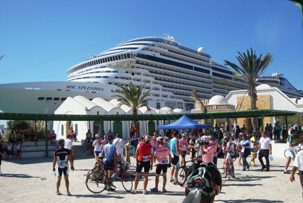 Dans ce cadre, les cyclistes participants ont fait escale au port de croisière de La Goulette mardi 09 octobre 2012. A 7h30, ils ont effectué le départ en vélo du port à la découverte de la ville. Habillés en maillots roses, ils ont réalisé l’itinéraire suivant : La Goulette, Carthage, Sidi Bou Saïd, La Marsa, Raoued, Kalaat Landlous, Riadh El Andalous, pour rejoindre au bout de deux heures le village touristique de croisière Goulette Village Harbor, où un accueil festif les attendait sur la placette centrale du village.