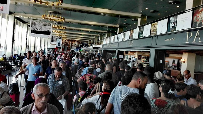 Des encombrements monstres de passagers, déjà signalés depuis le mois de juin dernier, ont certainement atteint leur paroxysme hier avec des temps d’attente de 2h00 entre l’entrée dans l’espace sous-douane et l’arrivée au contrôle de sûreté, puis encore au moins 1h00 au contrôle de police, soit 3h00 au minimum de queue (sans compter la phase d’enregistrement des bagages au préalable).