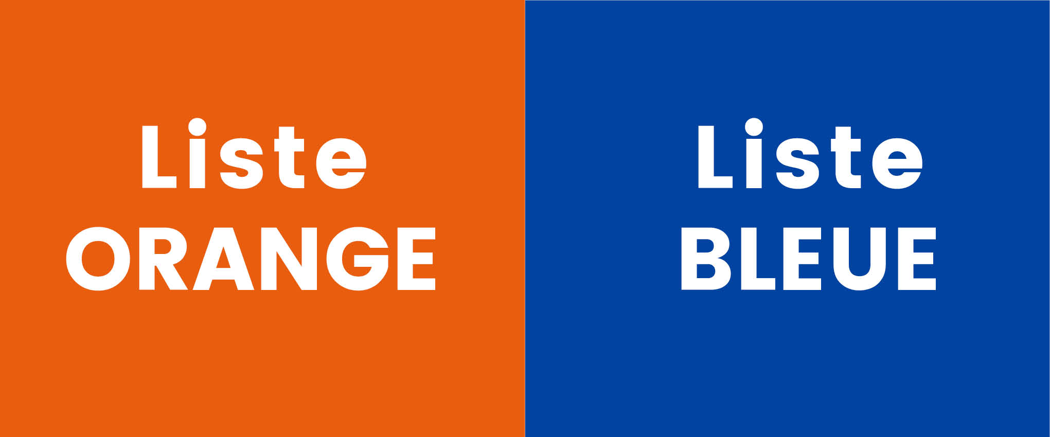 Deux listes ont déposé leurs candidatures et sont identifiées par deux couleurs, l’une orange et l’autre bleue. Ci-dessous les membres qui composent chacune d’elle.