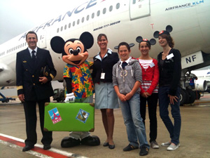 A l’occasion du vol inaugural, Mickey est venu exceptionnellement de Disneyland Paris pour créer la surprise au terminal 2E de l’aéroport Paris-CDG en venant saluer les passagers du vol AF694. Accompagné du « band musical » de Disneyland Paris, Mickey s’est prêté à une séance photo et a participé au coupé de ruban en salle d’embarquement pour offrir un moment magique à tous les participants. Le commandant de bord et une hôtesse l’ont même accueilli au pied du Boeing 777-300ER pour une photo avec 3 enfants faisant partie d’un groupe des 15 collégiens invités par la Fondation Air France. Ces enfants, résidant dans des communes limitrophes de l’aéroport de Paris-CDG, ont été conviés par la Fondation Air France à découvrir les nombreux atouts touristiques d’Orlando, de Disney World au Kennedy Space Center. Sous forme de carnets de voyage, ils vont réaliser un reportage photographique de leur séjour. Leurs photos feront d’ailleurs l’objet d’une exposition en septembre au siège social de la compagnie.