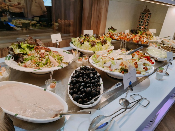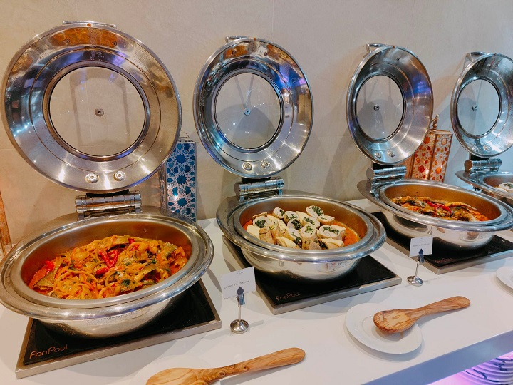 Sous forme de buffet, les plats principaux proposés sont à base de viandes et de poissons: poisson à la sfaxienne, poulet ricotta épinard, madfouna, calamar farci, etc.