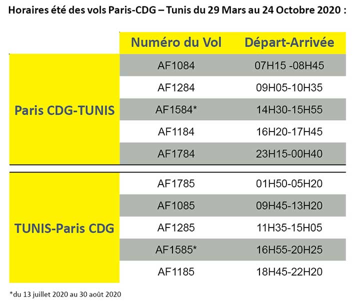 Le bureau d’Air France à Tunis annonce également qu’aux mêmes dates, aura lieu le rajout d’une fréquence entre Paris-CDG et Tunis, ce qui portera à 5 le nombre de vols quotidiens entre les deux capitales.