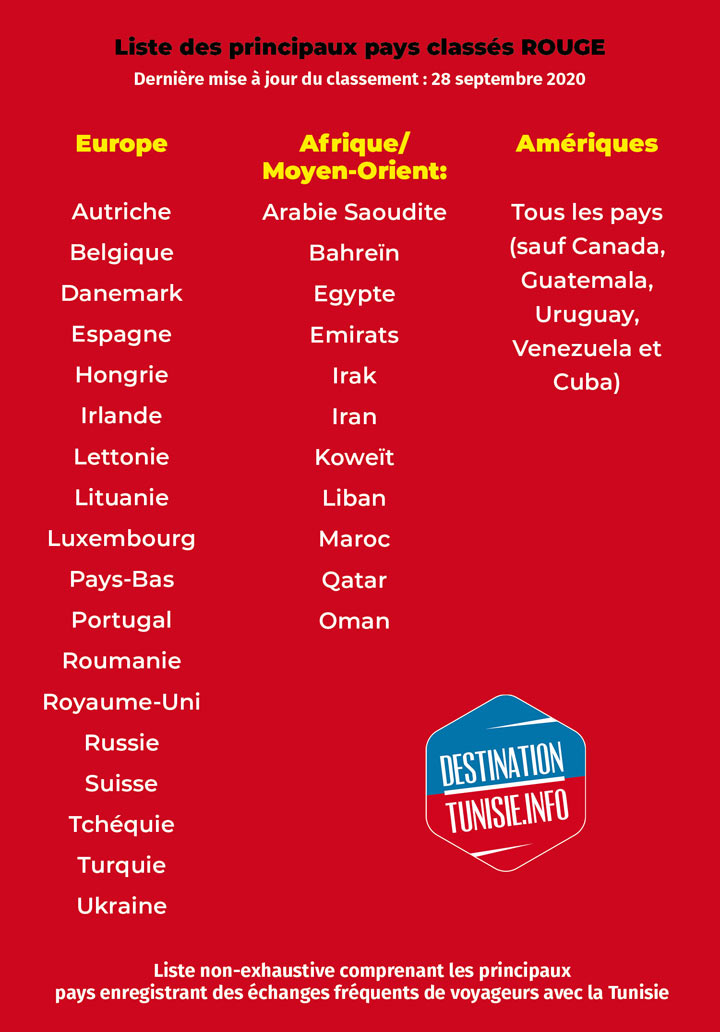 Pour les voyageurs individuels provenant d’un pays ROUGE, les seules conditions pour entrer en Tunisie sont: que vous ayez la nationalité tunisienne, ou que votre conjoint soit Tunisien, ou que vous résidiez en permanence en Tunisie ou que vous soyez diplomate accrédité officiellement. En dehors de ces conditions, vous ne serez malheureusement pas accepté à l’embarquement d’un vol pour la Tunisie.