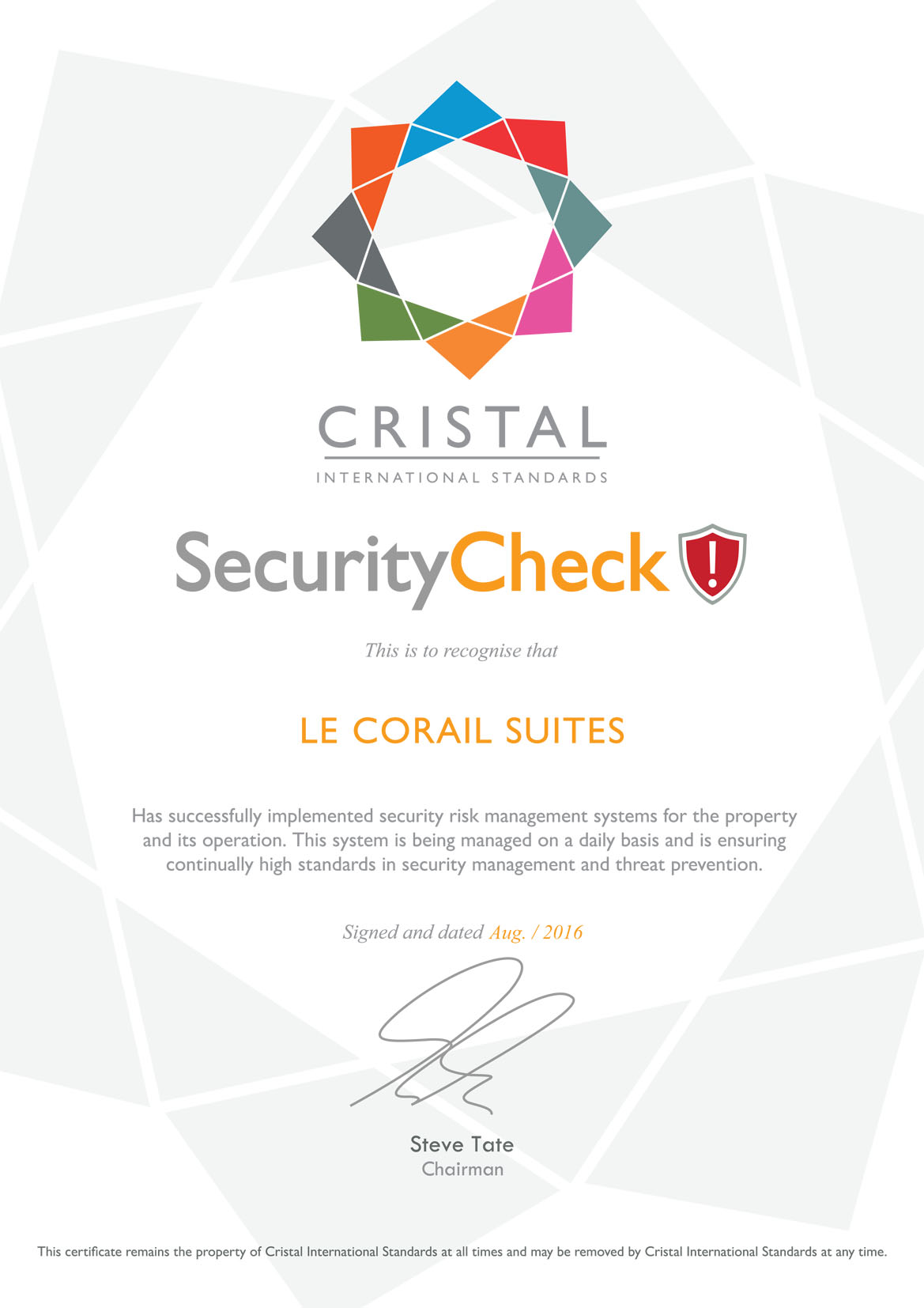 Le Corail Suites Hotel obtient le certificat de sécurité de Cristal International Standards