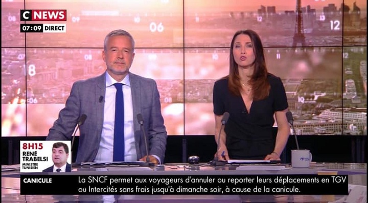Parti sur le vol de nuit de la compagnie Air France, René Trabelsi a entamé sa journée par une présence sur C-News à Paris où il était l’invité de Jean-Pierre Elkabbach dans La Matinale de la chaîne à une heure de grande écoute pendant 21 minutes (de 8h15 à 8h36).