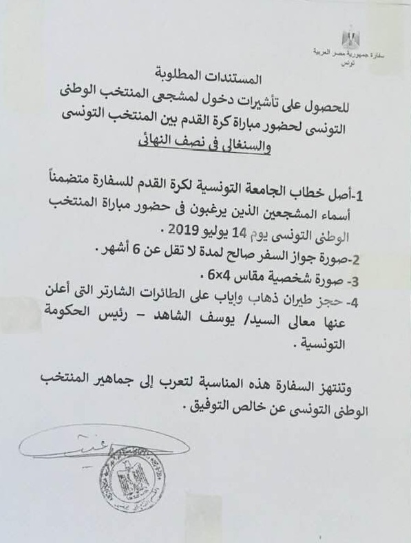 Mais ce sont les autorités consulaires égyptiennes qui risquent de retarder le départ des supporters. Dans un courrier dont nous avons obtenu une copie (ci-dessous), l’ambassade d’Egypte en Tunisie exige des candidats au voyage de figurer sur une liste officielle émise par la Fédération tunisienne de football.