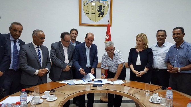 Cérémonie de signature de l’accord entre la FTH et l’UGTT pour l’augmentation de 6% des salaires des employés du secteur en présence du ministre des Affaires sociales et de la ministre du Tourisme le 15 septembre 2016.