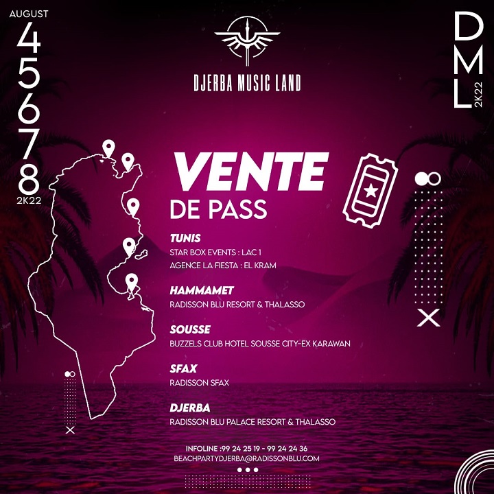 Durant cinq jours, DML fera danser ses festivaliers jusqu’au petit matin sur une scène surplombant la mer. Les spectacles de lumière, de cirque et un système son de haute qualité sublimeront encore plus une programmation haute voltige. Le DJERBA MUSIC LAND est considéré aujourd’hui comme un véritable agitateur de l’animation touristique estivale et de l’activité économique de l’île de Djerba.