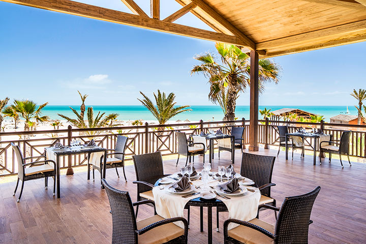 L’hôtel propose une offre tout compris avec 7 restaurants et bars. Les clients pourront savourer des produits naturels, frais et faits maison. Il y a tout d’abord le restaurant Buffet : Entièrement rénové, avec une grande terrasse offrant un espace de restauration, il sert le petit-déjeuner, le déjeuner et le dîner. L’hôtel propose également un restaurant thématique méditerranéen à l’heure du dîner avec une vue panoramique sur la mer, proposant trois thèmes : fruits de mer, italien et tunisien.