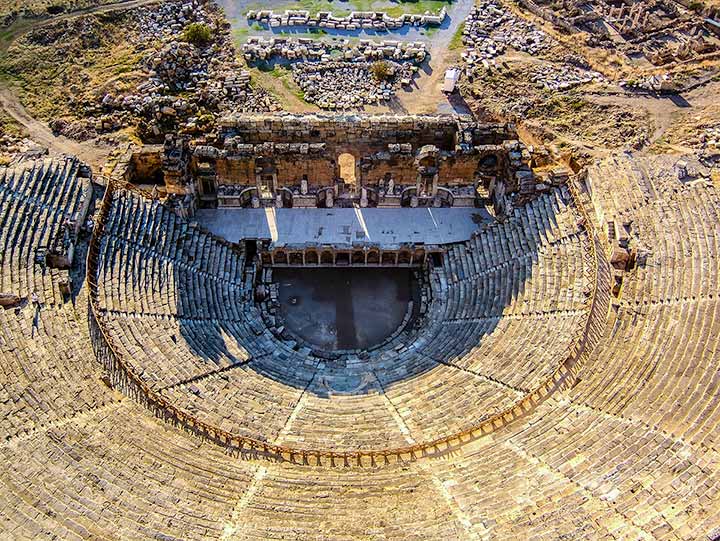 Parmi les autres édifices de Hiérapolis, citons le théâtre antique et le musée de Hiérapolis. Le théâtre se distingue des autres théâtres de l’époque romaine dans le bassin méditerranéen par ses reliefs caractéristiques représentant des histoires mythologiques et par la splendeur de sa scène et de ses gradins. S’asseoir au sommet de ce théâtre à couper le souffle et observer toute la région en toute tranquillité pendant des heures est une expérience exceptionnelle.