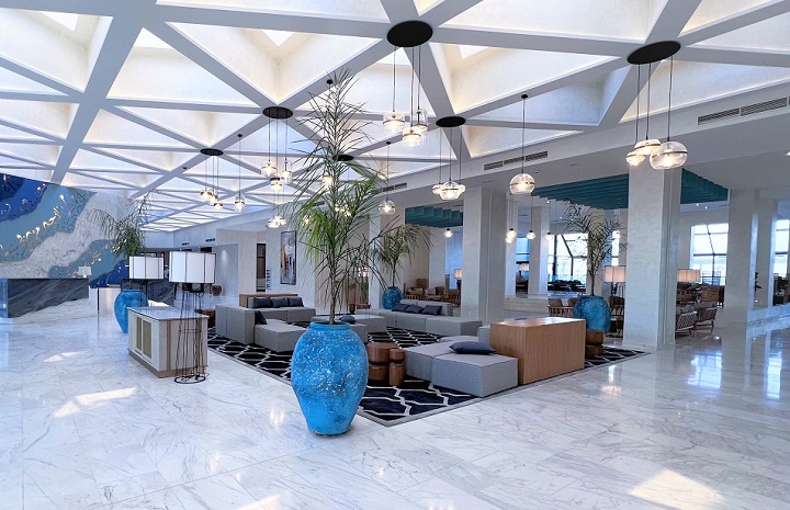 Les intérieurs du complexe offrent une interprétation unique de l’héritage tunisien, créant un sentiment exclusif de lieu où le design raconte une histoire et les espaces ont une signification. Les clients sont accueillis dans le hall avec des couleurs marines chaleureuses- blanc et turquoise qui les transportent dans un monde de calme.