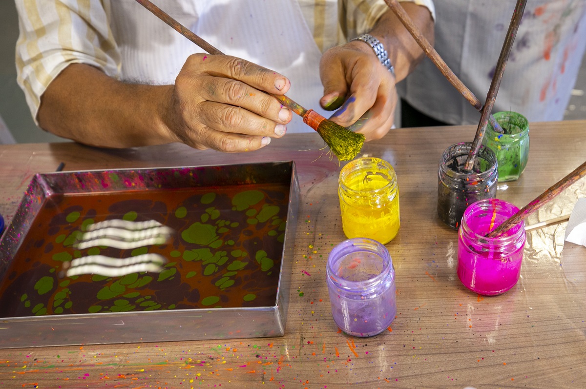 Zohra Zarrouki , l’enseignante d’Ebru (L’art du marbrage) à l’Institut Yunus Emre de Tunis, est une artiste tunisienne qui a appris cette forme d’art unique à Istanbul, a exprimé ses efforts pour promouvoir l’art de l’Ebru en Tunisie, en déclarant : « Je donne des cours d’Ebru à l’Institut Yunus Emre. Nos étudiants de tous âges et professions apprennent les subtilités de l’art de l’Ebru ici. »