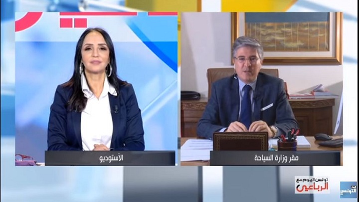 En visioconférence, le ministre du Tourisme et de l’Artisanat répondant aux questions de Myriam Belkadhi sur la chaîne El Hiwar Ettounsi.