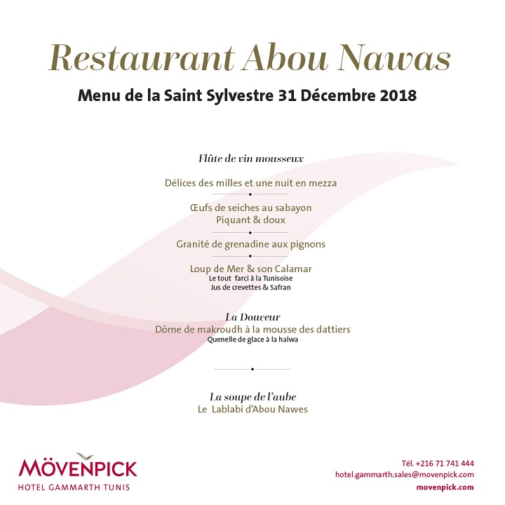 La direction de l’hôtel Mövenpick à Gammarth a choisi la date toute symbolique du 31 décembre pour procéder à la réouverture en avant-première de son restaurant Abou Nawas pour accueillir la soirée du Nouvel an.
