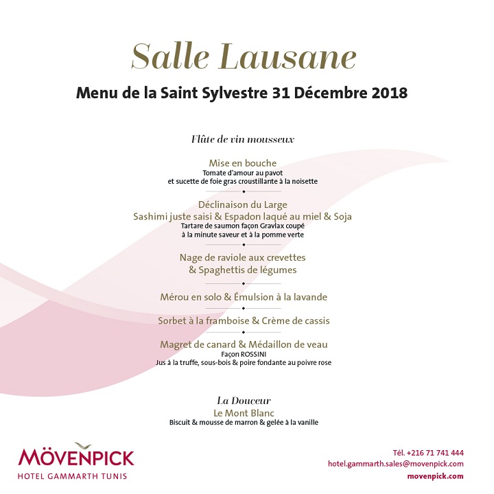 Par ailleurs, l’hôtel a prévu également une grande soirée dans sa salle Lausanne avec un dîner gastronomique (ci-dessous). Les convives seront reçus au lobby pour un apéro au son la saxophoniste russe Tatiana. Par la suite et pour animer les soirées, c’est le live band qui assurera la prestation musicale pour la dernière veillée de l’année.