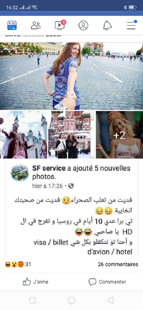 Une publicité sponsorisée sur Facebook publiée le week-end dernier a une nouvelle fois fait déborder le vase. Elle invitait les Tunisiens à aller en Russie pour des sous-entendus peu orthodoxes: « Marre des fennecs ? [femmes laides] Marre de ta copine moche ? Alors vas passer 10 jours en Russie et profite de la HD ! Et nous, on s’occupe de toutt : visa, billet d’avion et hôtel ». Cette annonce a fait le buzz sur le réseau social et même largement reprise par certains médias, avec tous les sarcasmes qui vont avec et les critiques à l’égard du secteur des agences pour sa manière de faire.