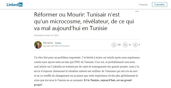 Dernière en date, celle publiée hier simultanément sur Facebook et LinkedIn dans laquelle elle revient sur son passage à Tunisair et son projet pour « sauver la compagnie ».
