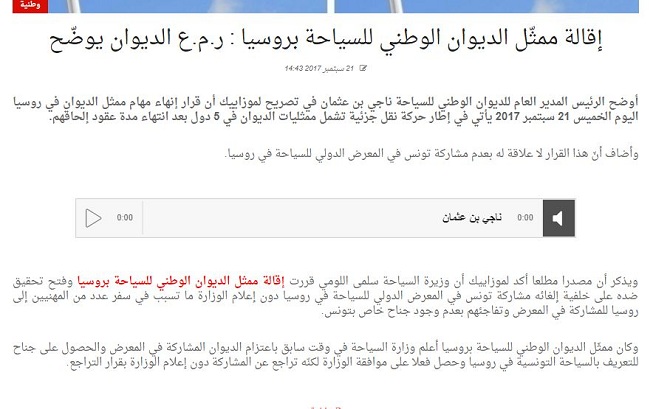 Cette déclaration était de toute évidence une réaction à ce que la même station avait annoncé plus tôt sur sa page web. Mosaïque avait en effet affirmé quelques heures auparavant qu’il s’agissait bien d’un limogeage décidé par la ministre du Tourisme et de l’Artisanat et était consécutif à l’affaire du stand du salon de Moscou (capture d’écran ci-dessous). Sauf que Mosaïque n’a pas cité la source de son information mais connaissant la rigueur de la station dans le traitement de ce genre de sujet, il est évident que cette source était connue, fiable et autorisée.