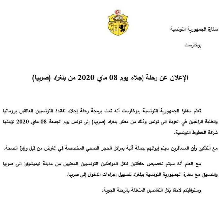 8 mai: vol Tunisair sur Belgrade+ étudiants arrivant par bus de Timisoara
