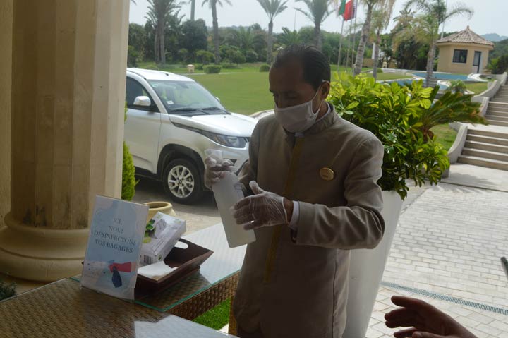 Pour le cas d’un groupe de touristes, la prise en charge du client se fait dès l’entrée à l’hôtel par un chasseur qui le guide dans un circuit bien établi. Les protocoles sont appliqués jusqu’aux moindres détails. Le personnel s’occupe de désinfection des bagages et de les acheminer vers les chambres. D’ailleurs, les bagages ne suivent pas le même circuit du client.