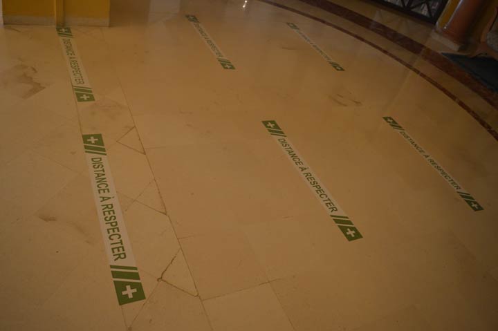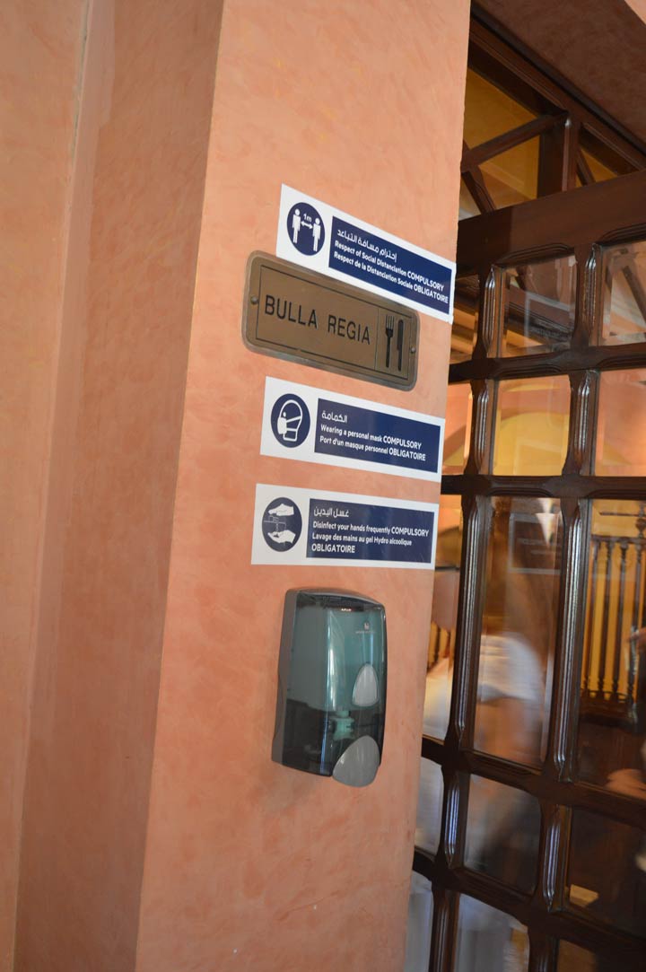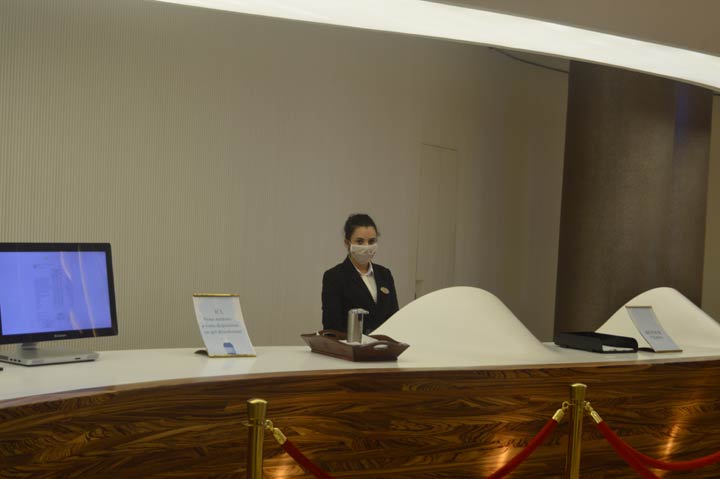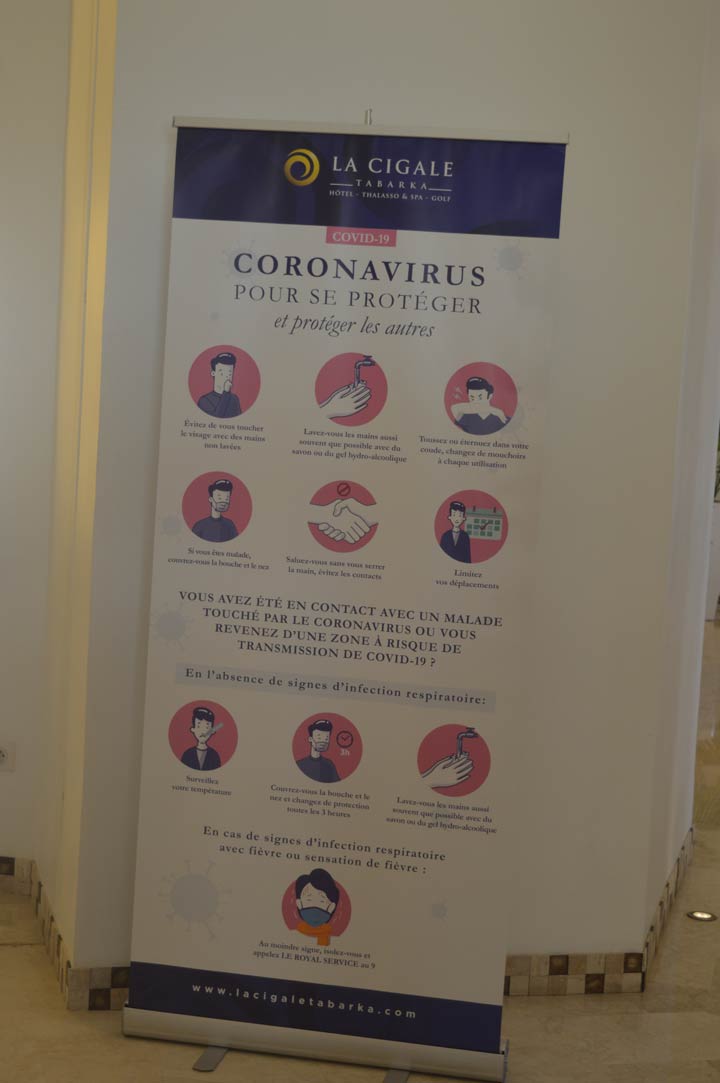 Accueillis d’abord à La Cigale Tabarka, deux membres du personnel en blouses blanches assurent la prise de température de chaque visiteur et la distribution de gel désinfectant. Si la température prélevée dépasse 38 degrés, l’accès à l’hôtel sera refusé au visiteur et le personnel devra appeler desuite les services de santé selon les normes du Protocole sanitaire.