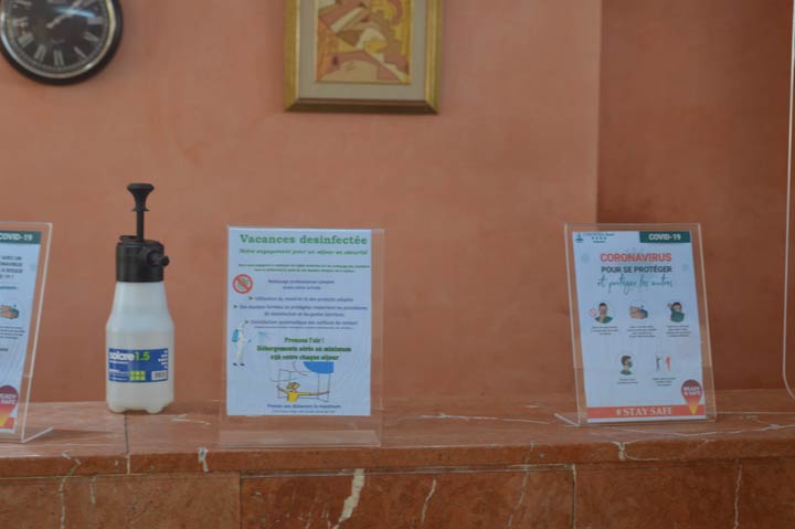 La troisième étape était à l’hôtel Mimosas, un hôtel authentique. L’établissement respecte de même toutes les normes d’hygiènes et du Protocole sanitaire dans les différents espaces à partir de la réception en passant par les chambres, la piscine et même au niveau des espaces extérieurs. Par la suite, le groupe s’est dirigé vers Marina Prestige, un hôtel de quatre étoiles qui applique aussi parfaitement les règles d’hygiène. Des plexiglas sont installés au niveau de la réception pour protéger le client mais aussi le personnel.
