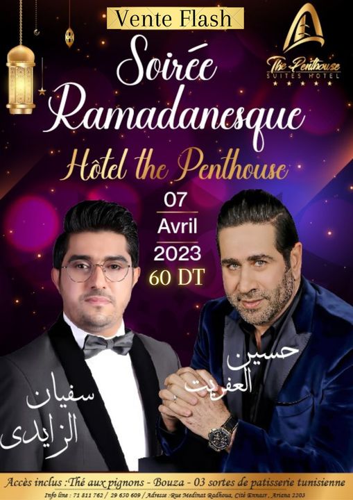 Pendant le mois de Ramadan, l’établissement a programmé pour la soirée du 7 avril un spectacle musical mettant en scène les deux chanteurs Houcine Afrit et Sofiane Zaydi proposé au prix de 60 dinars (inclus thé aux pignons, bouza, 3 sortes de pâtisseries tunisiennes).