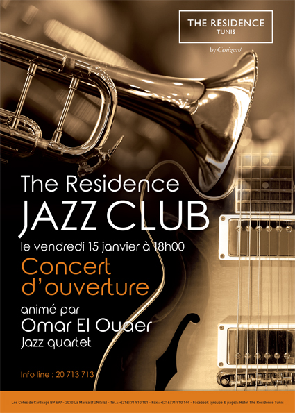L’hôtel The Residence Tunis célèbre la musique, mais pas n’importe laquelle. Entrée libre à compter du 15 janvier 2016, tous les soirs entre 18h30 et 21h30, un spectacle de jazz de haute qualité est proposé aux clients dans le cadre du nouveau Jazz Club initié par la direction de l’établissement.