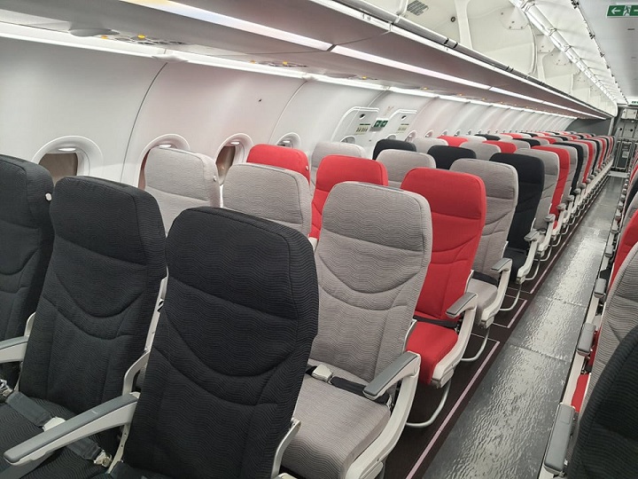 L’approche de Tunisair semble évidente: elle veut se réconcilier avec la clientèle dite à forte contribution en lui offrant des conditions de voyage plus confortables. La cabine économique est dotée de 138 sièges avec 3 rangées de chaque côté (s’agissant d’un mono-couloir). Là aussi, on a joué sur les couleurs de manière aléatoire avec des des sièges tons gris, noir, ou rouge.