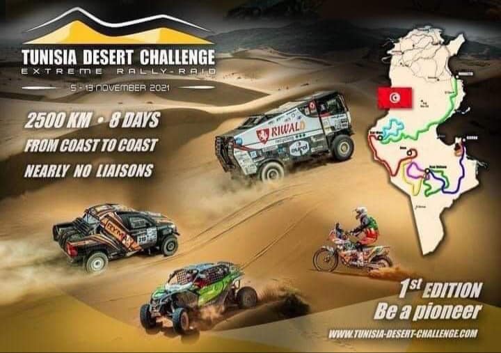 Le rallye Tunisia Desert Challenge s’élancera de Djerba. Du 6 au 13 novembre 2021, 450 participants et organisateurs de 25 pays s’affronteront dans une course épique. Le parcours comprendra 8 étapes dans le désert, 2500 km, des bivouacs magnifiques et la promesse d’un spectacle sans précédent.